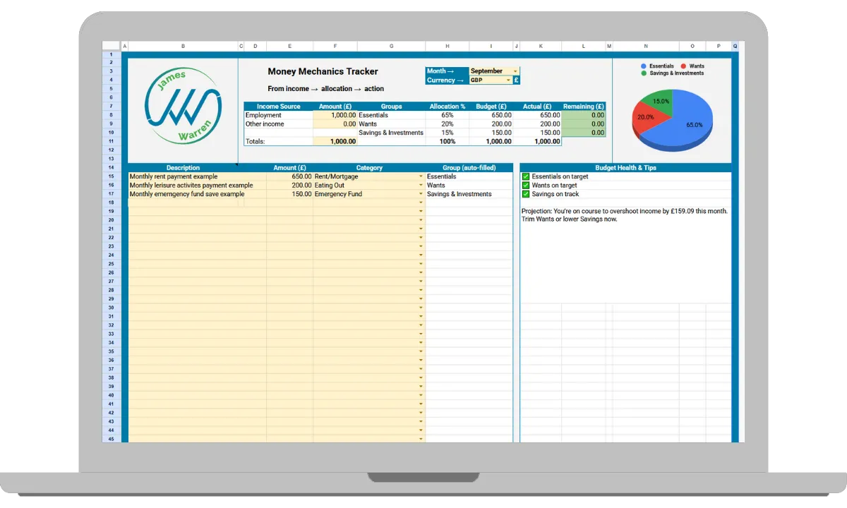 A one-page money tracker that converts everyday spending into clear actions. See where your money goes, stay within your income, and keep funding your future with confidence.